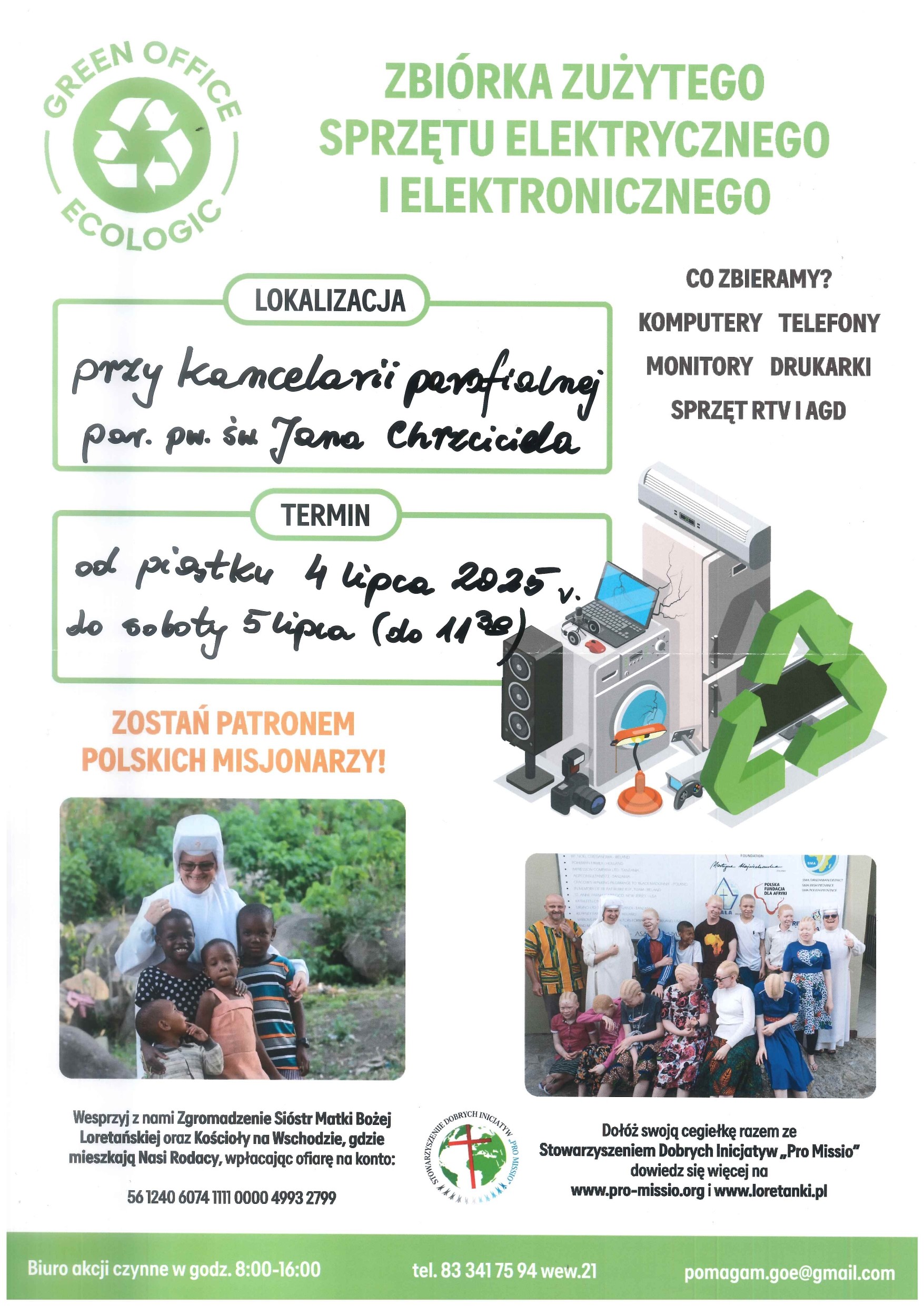 Zbiórka będzie miała miejsce w MIĘDZYRZECZU, przy kancelarii parafialnej parafii św. Jana Chrzciciela, od piątku 4 lipca 2025 r. do soboty 5 lipca, do godziny 11.30. (wyznaczona godzina jest godziną zakończenia zbiórki i odbioru zebranego sprzętu przez Green Office Ecologic).