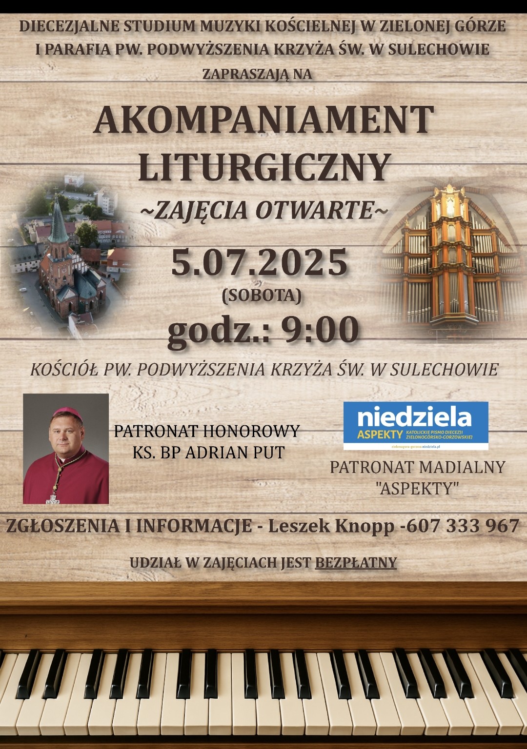 Zapraszamy na otwarte zajęcia „Akompaniament liturgiczny”. Odbędą się one pod patronatem ks. bp. Adriana Puta 5 lipca o godzinie 9.00 w Sulechowie.