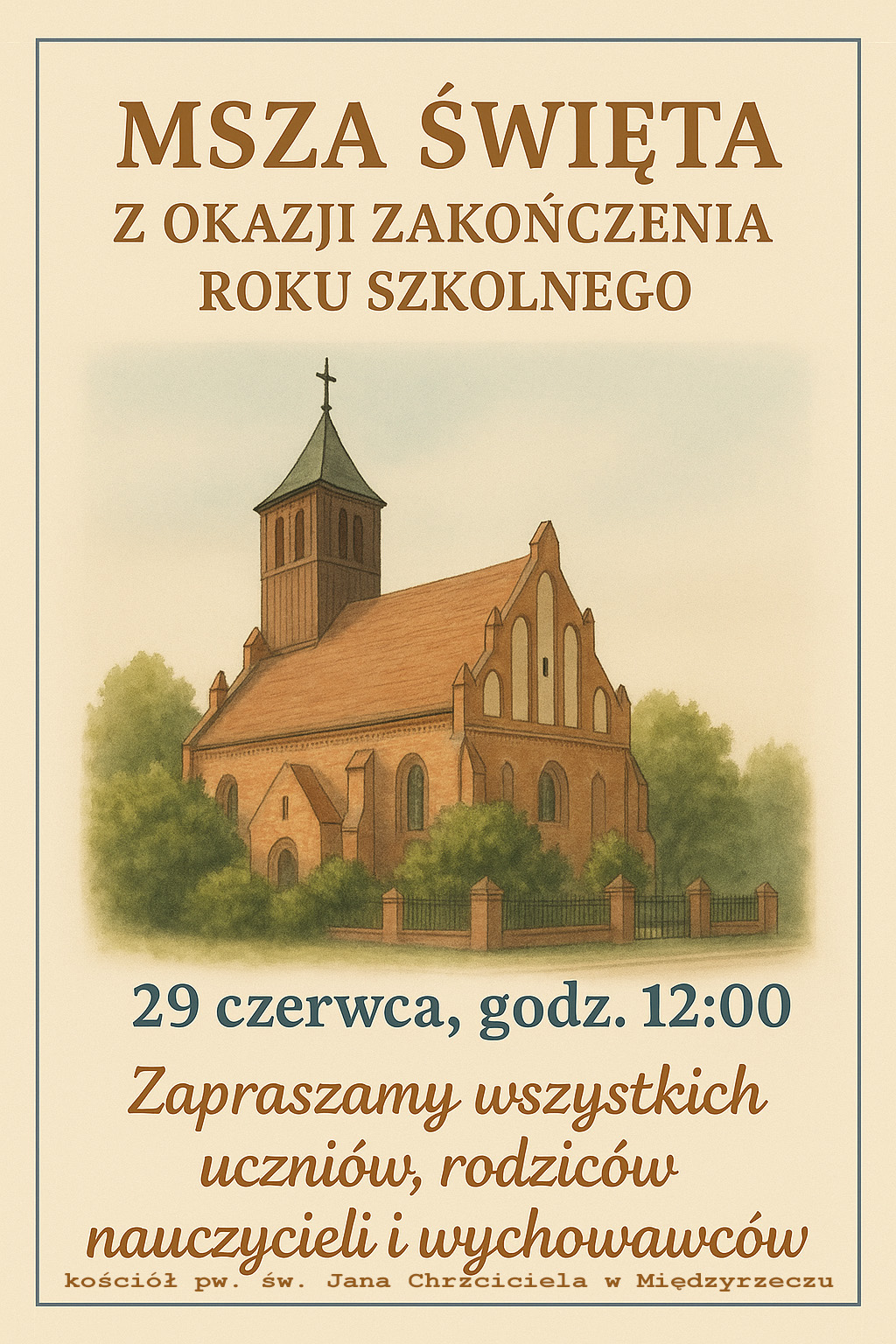 Zapraszamy uczniów, rodziców, katechetów, nauczycieli na dziękczynną Eucharystię kończącą rok szkolny A.D. 2025