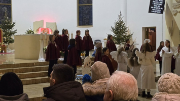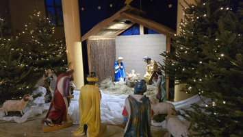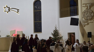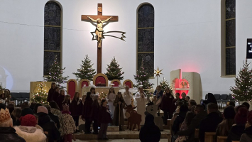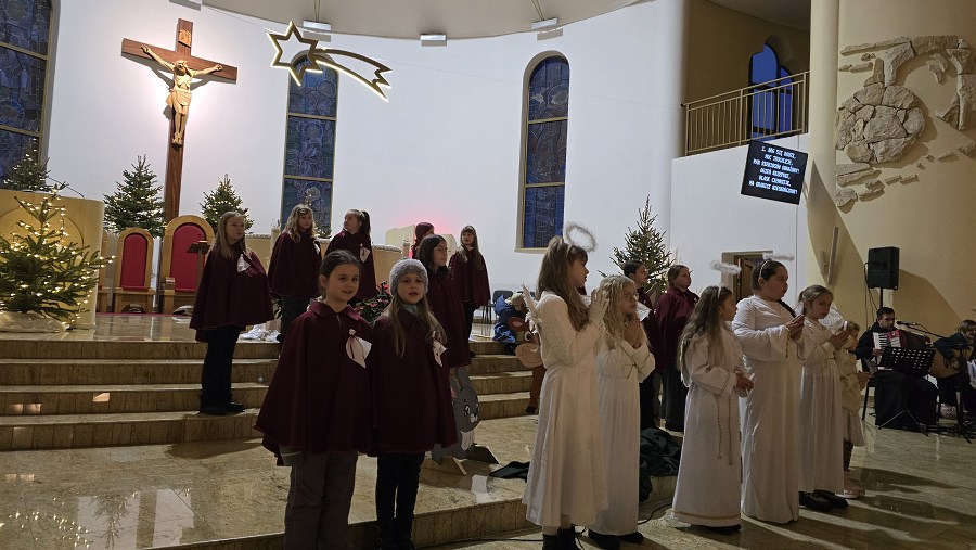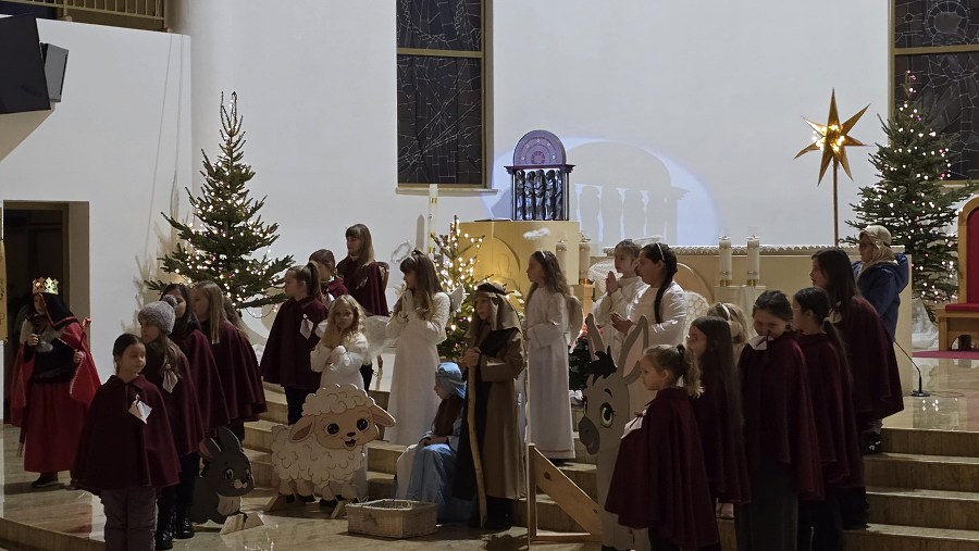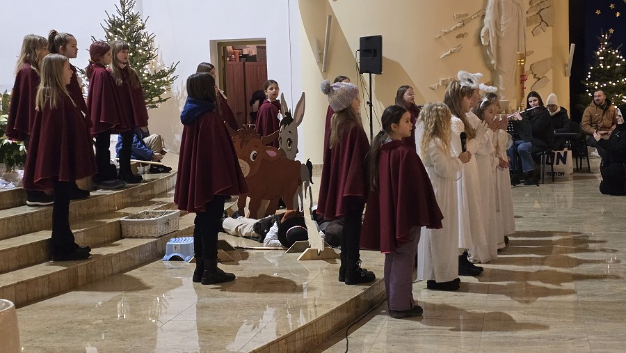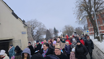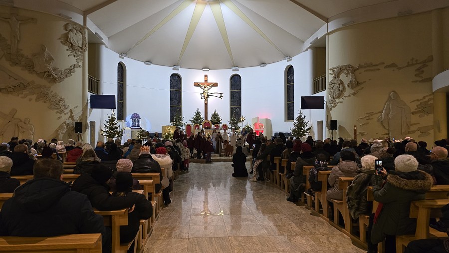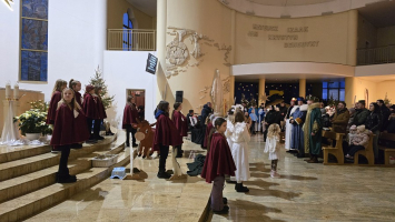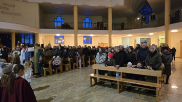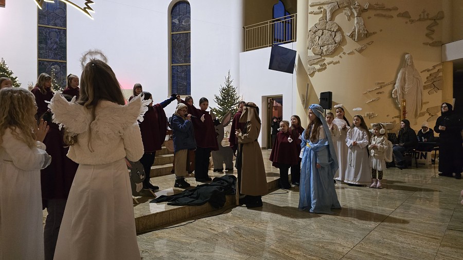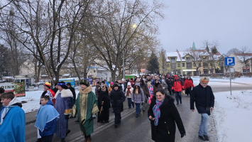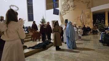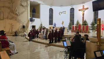 Z naszej fary, połączyliśmy się z „karawaną” z parafii św. Wojciecha, a dalej już razem Trzej Królowie, za przewodem gwiazdy, wyruszyli do sanktuarium Pierwszych Męczenników Polski w Międzyrzeczu, gdzie odbyły się piękne jasełka dzieci.
